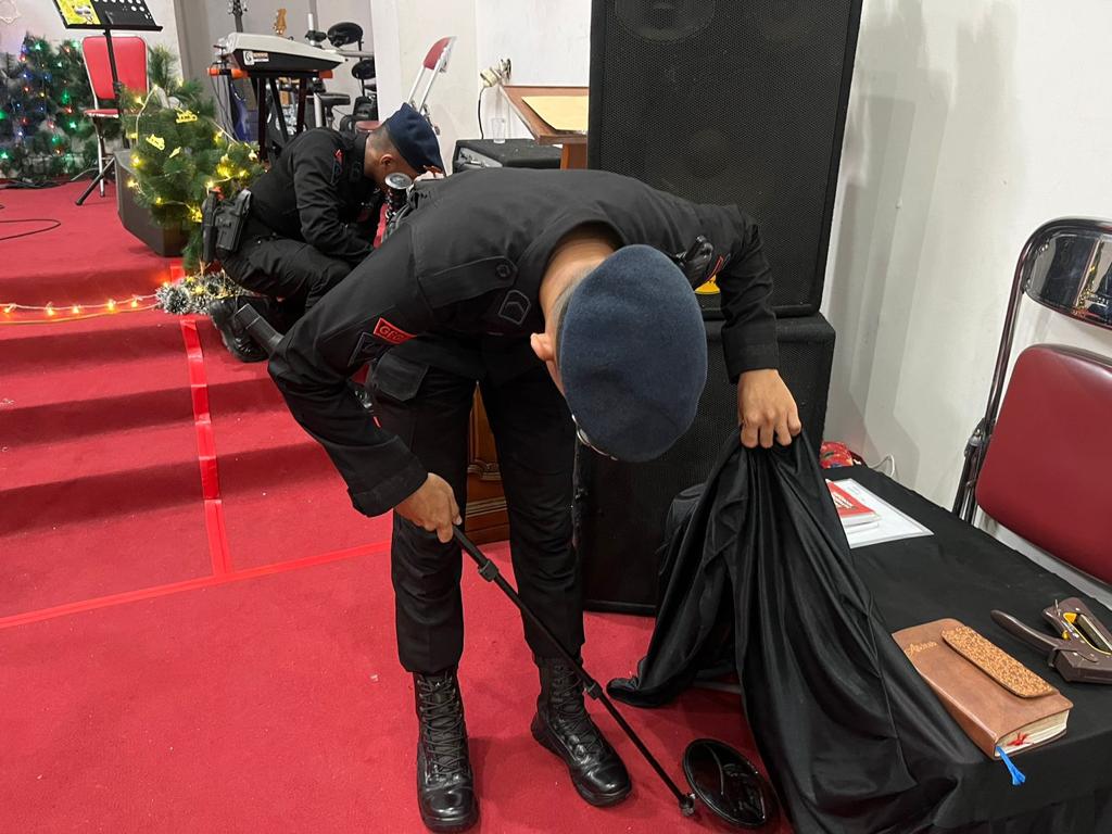 BANTEN, Kencana Media – Sterilisasi Gereja dilakukan Unit Jibom Detasemen Gegana Satbrimob Polda Banten, tidak ditemukan barang mencurigakan dalam sterilisasi tersebut. Kegiatan sterilisasi diikuti dengan menyiagakan personel khusus untuk mengamankan Hari Natal dan Tahun Baru (Nataru) dalam rangka Pam Ops Lilin di Wilayah Hukum Polda Banten pada Minggu (24/12).