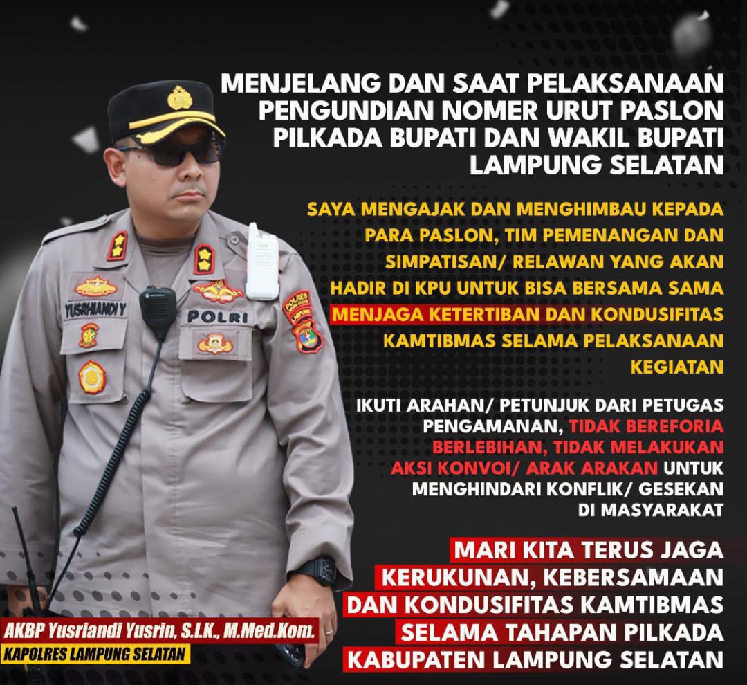Untuk itu, Kapolres Lamsel, AKBP Yusriandi Yusrin mengeluarkan, imbauan kepada para paslon dan elemen pendukung yang akan hadir saat pengundian nomor urut.
