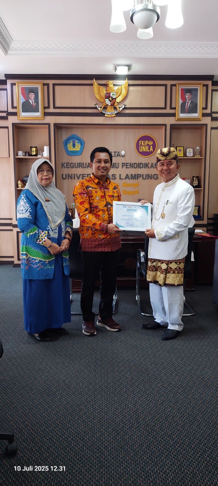 10 Juli 2025 – Program Studi Pendidikan Bahasa dan Kebudayaan Lampung (MPBKL), Pascasarjana FKIP Universitas Lampung kembali menguatkan sinergi antara dunia akademik dan tokoh masyarakat dalam kegiatan ujian tesis mahasiswa di ruang Dekan FKIP Unila.