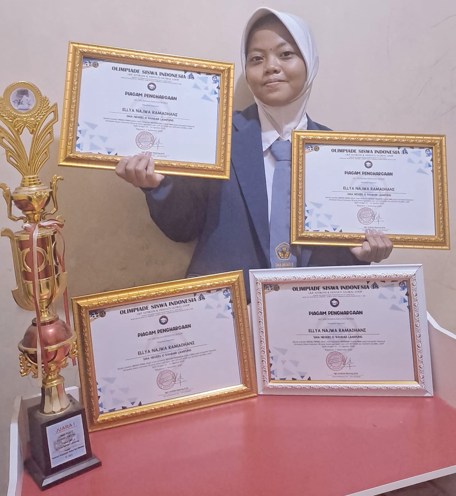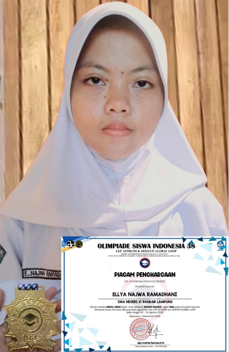 Siswi SMA Negeri 10 Bandar Lampung ini berhasil memborong 3 medali emas dan 1 medali perak pada ajang Olimpiade Siswa Indonesia (OSI) 38 yang diselenggarakan LKP Astikom bekerjasama dengan startup Deehati Global Loop, dilaksanakan secara online diikuti seluruh siswa jenjang SMA, SMK, MA dari berbagai penjuru di Indonesia serentak pada tanggal 30 hingga 31 Agustus 2025.
