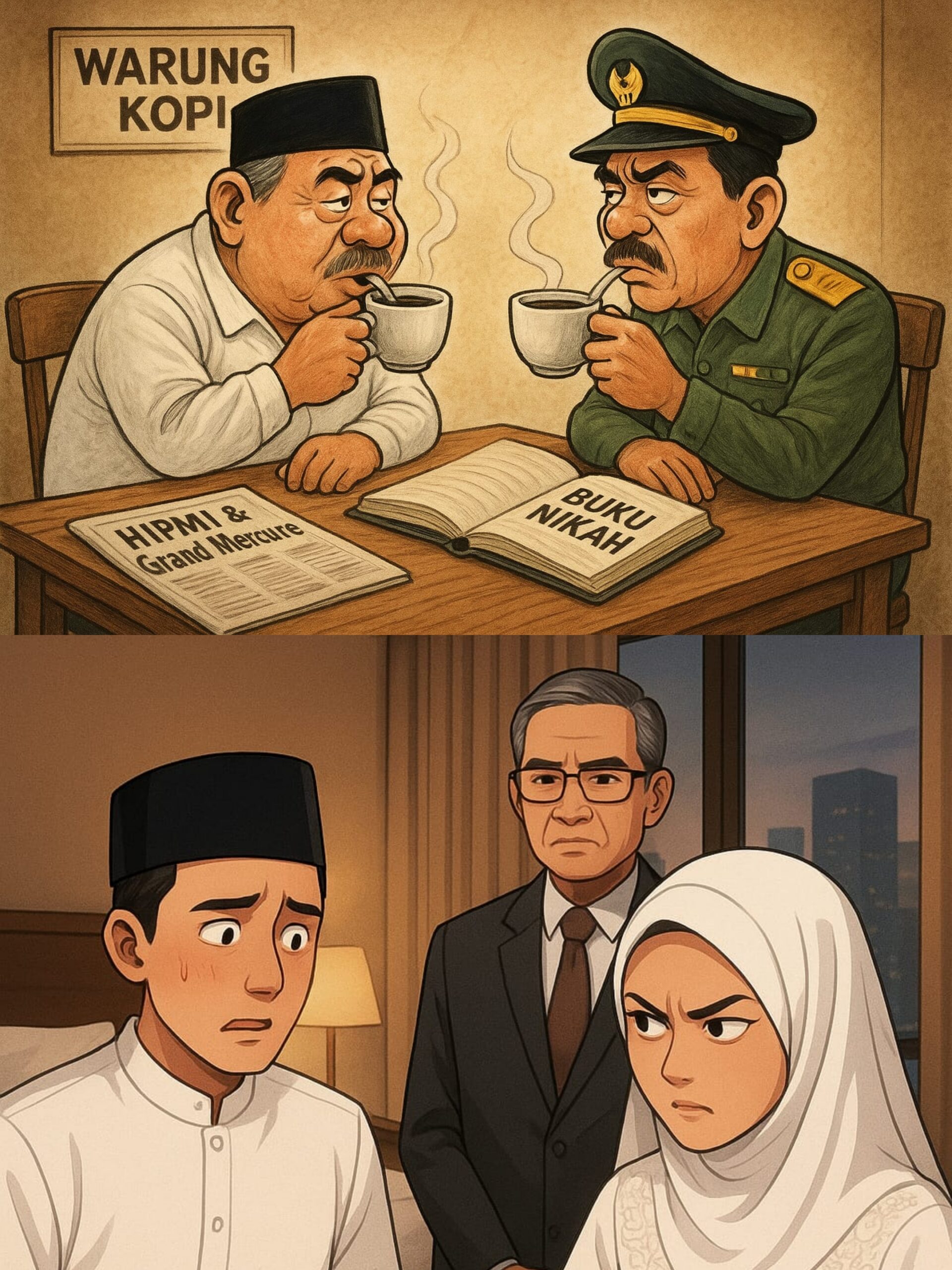 Di sebuah warung kopi sederhana di pojokan pasar, Pak Haji dan Panglima duduk menghadap gelas kopi hitam panas. Udara sore agak gerah, tapi obrolan mereka jauh lebih panas-tentang gosip GM yang belakangan bikin heboh.